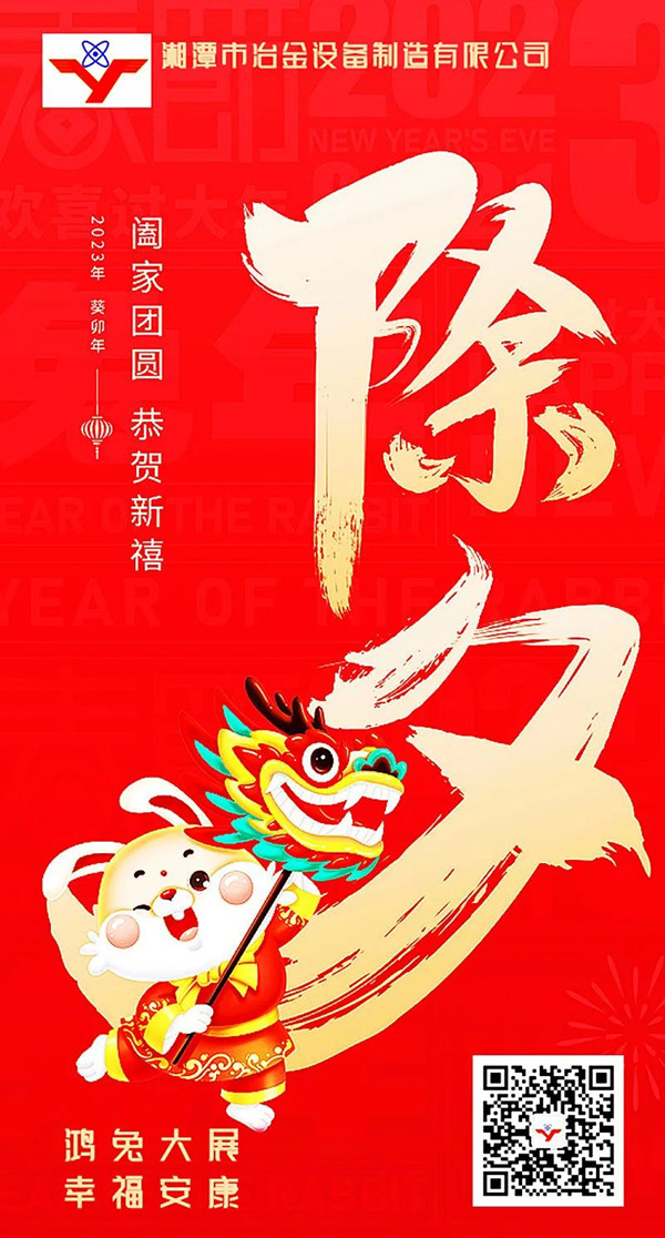 ”爆竹聲聲一歲除,歡天喜地迎新春“。在震天的鞭炮聲中,在滿天璀璨的煙花里,我們與2022揮手告別,與嶄新的2023年深情相擁……陪伴是最深情的告白,相守是最溫暖的承諾。除夕之夜,最大的幸福莫過于和家人團聚,最大的快樂莫過于陪父母長輩談心,最好的祝福就從湘潭市冶金設備這里傳遞……值此農(nóng)歷除夕到來之際,國內冶金礦山設備非標定制專家——湘潭市冶金設備制造有限公司衷心祝愿所有客戶、伙伴、朋友、家人們:除夕團圓! 新年歡喜!鴻兔大展! 萬事如意!祝天下所有父母:健康長壽,平平安安!祝天下所有家庭:溫馨和睦,幸福美滿!
